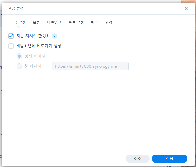 -> 시놀로지를 재부팅하거나, 도커의 오류 등으로 컨테이너가 종료되는 경우 자동으로 재시작시켜주는 기능이다.