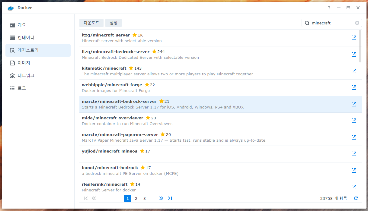 레지스트리 탭 시놀로지 도커 앱을 실행한 후, 레지스트리 탭을 클릭하여, 우측 상단에 검색창 minecraft를 검색하여 marctv라는 분께서 올린 이미지 파일을 검색하여 다운로드 받는다.