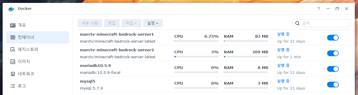 컨테이너 탭 완료 버튼을 누르고 컨테이너 탭을 누르면 마인크래프트 베드락 서버가 구동 중인 것을 확인할 수 있다.