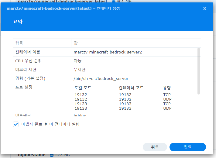 cp -r /bedrock-server /root시놀로지 도커 볼륨 설정시 에러 (Docker API 실패)