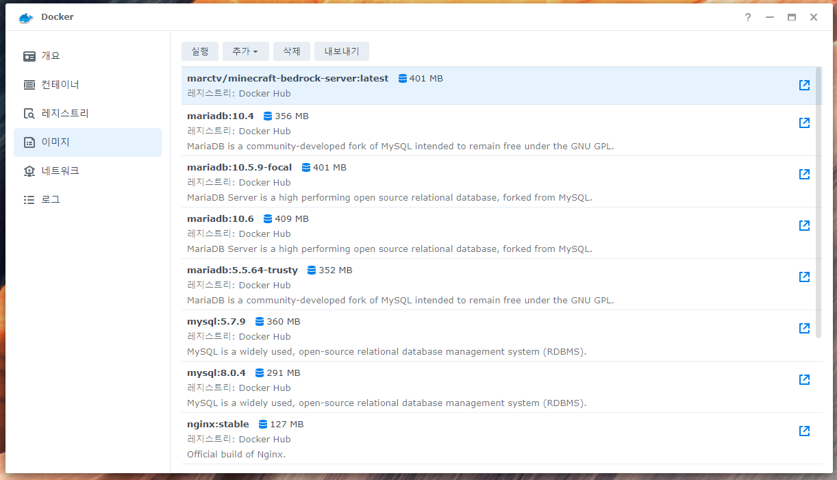 이미지 탭 다운로드가 완료되면 이미지 탭에 marctv/minecraft-bedrock-server:latest라는 이미지가 받아진 것을 확인할 수 있다.