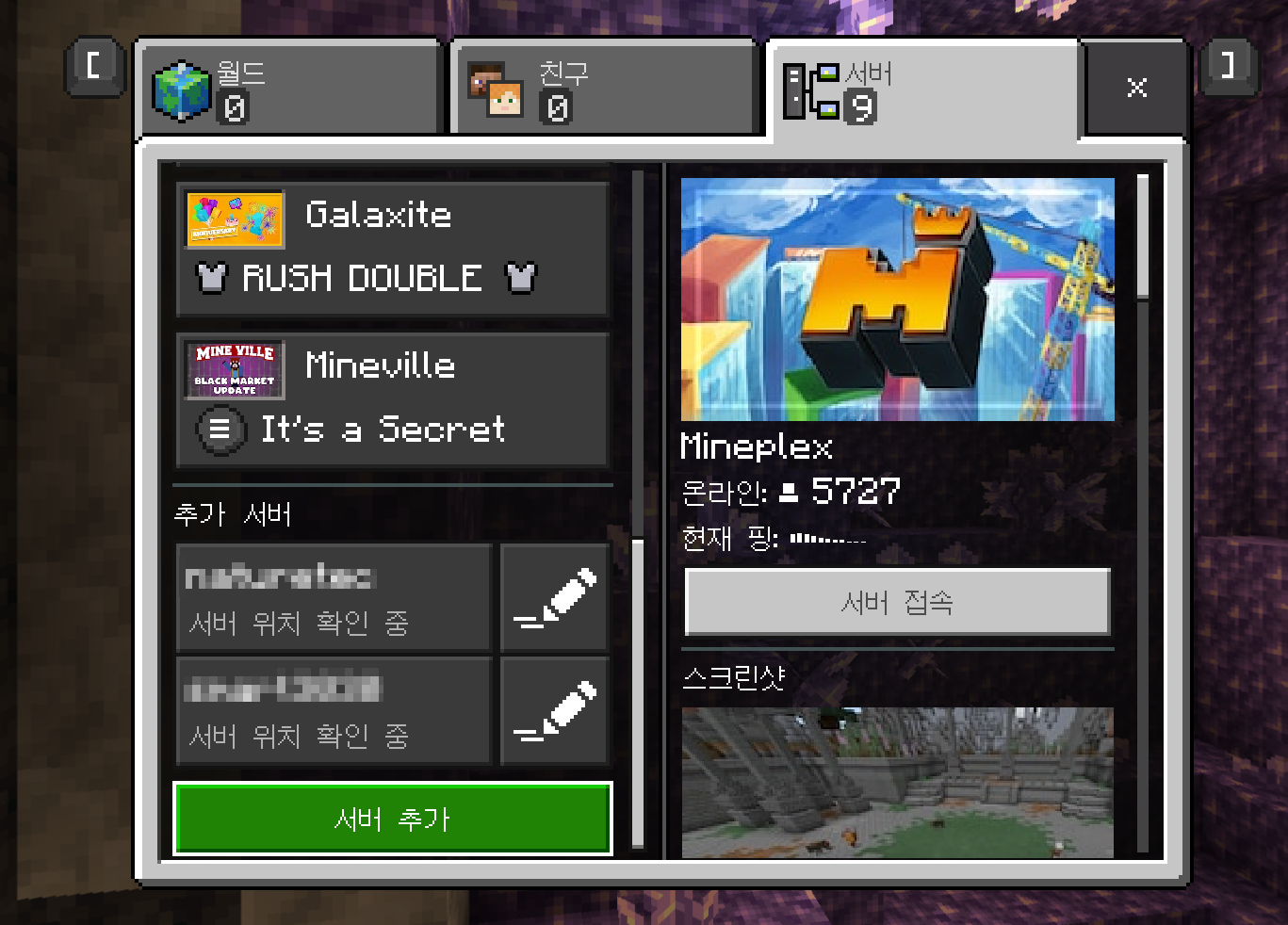 마인크래프트 PE 마인크래프트 PE버전(Microsoft store 다운로드 버전)을 켜고 서버 탭에서 가장 아래로 내려보면 서버추가 버튼이 있다.