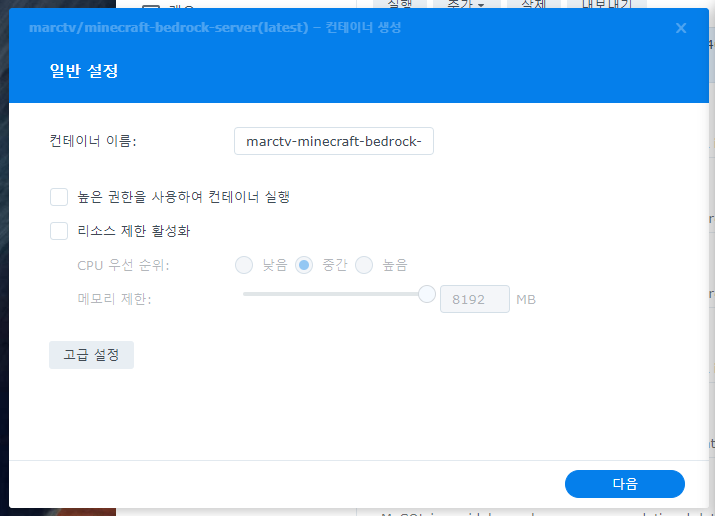 컨테이너의 이름을 구별할 수 있도록 적당히 생성하고, 고급 설정에 들어가서 몇가지 설정을 해준다.